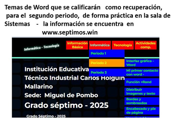 Estimados estudiantes, en el periodo 2, se han dejado varios trabajos que se encuentran en la página web www.septimos.win, opción informática, periodo 2